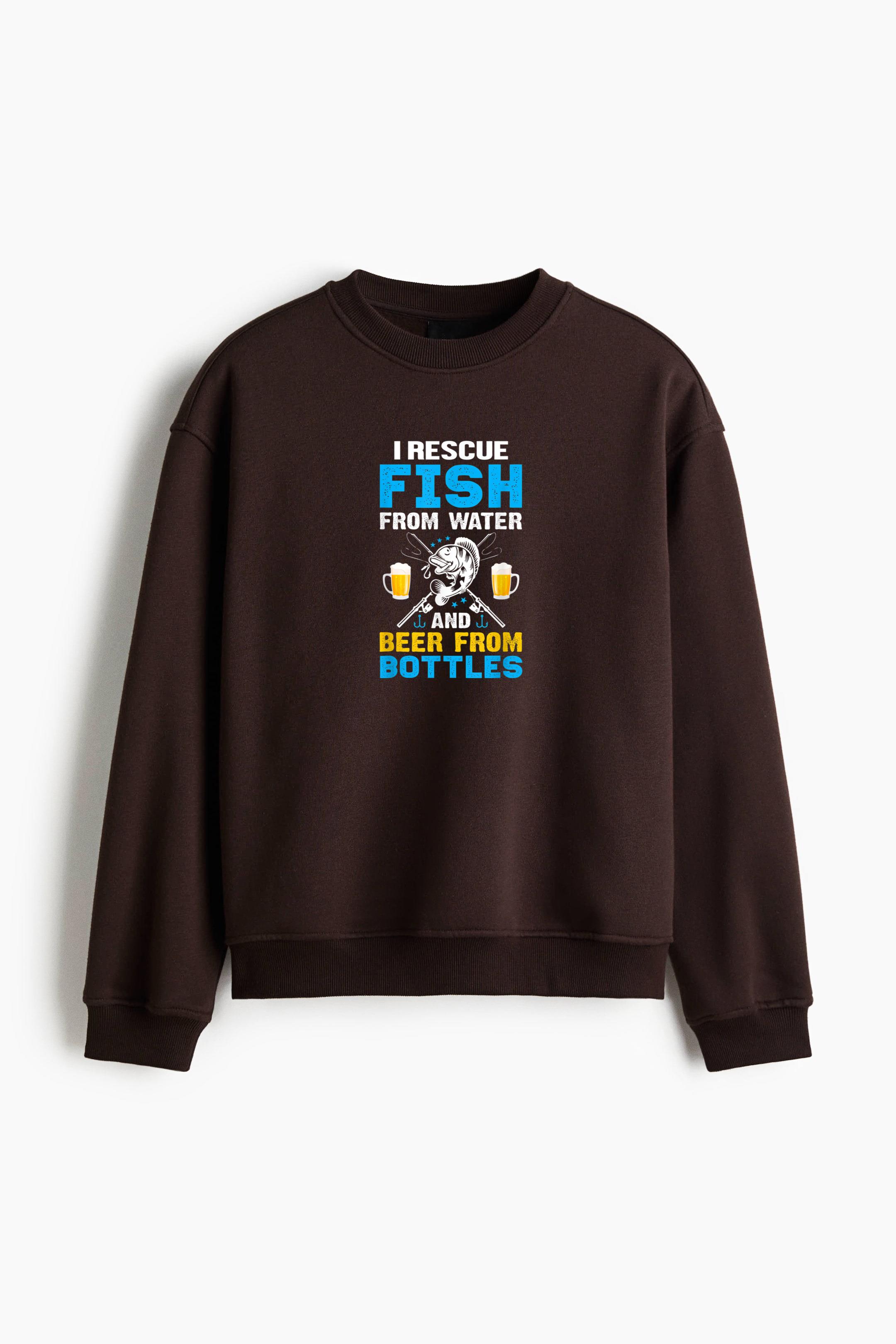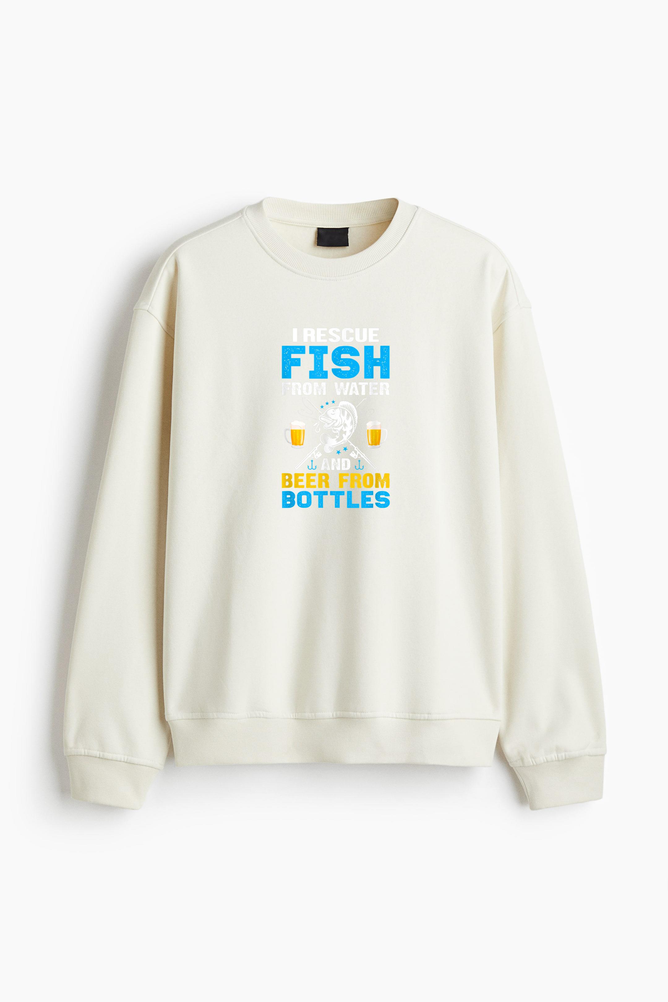 I Rescue Fish From Water And Beer From Bottle Regular Fit Printed Sweatshirt Regular Fit Printed Sweatshirt – Soft Cotton Fleece Pullover with Graphic Design